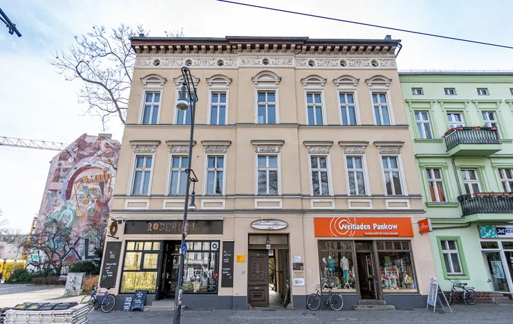 This well-maintained commercial building is located in Berlin Pankow. The ground floor houses a retail unit and a restaurant. The outdoor area of the restaurant is located in the rear courtyard. The three upper floors host office units. Built in 1900, the building was later extended and renovated.